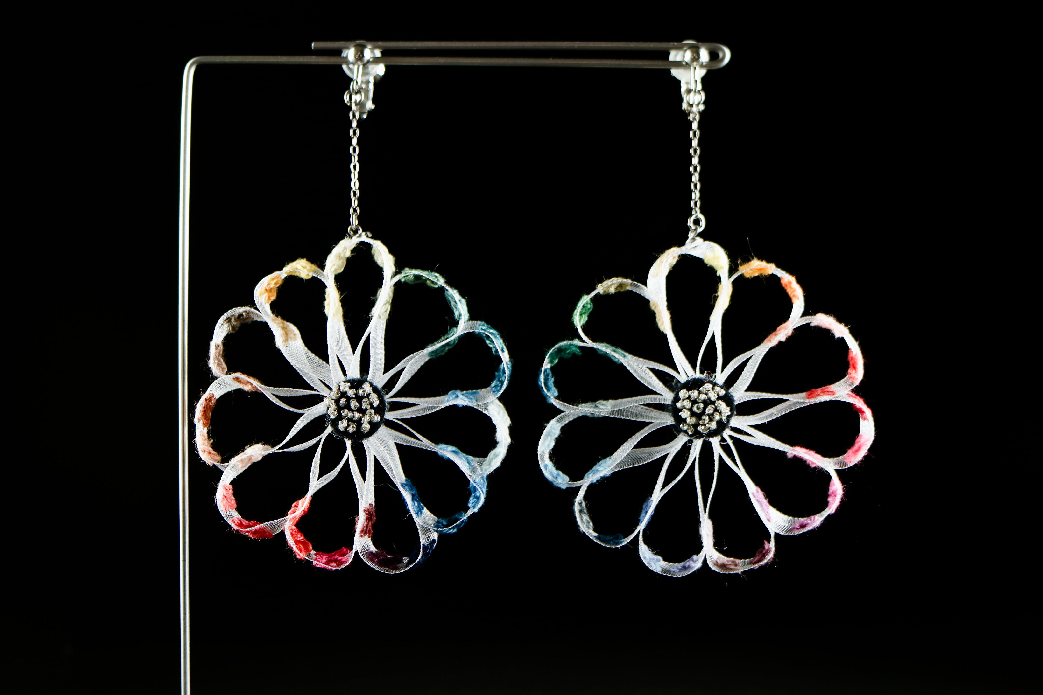 草木染め刺繍糸、オーガンジーリボン、フェルトなどを使用した個性的なデザインが特徴のイヤリング/ピアスです。