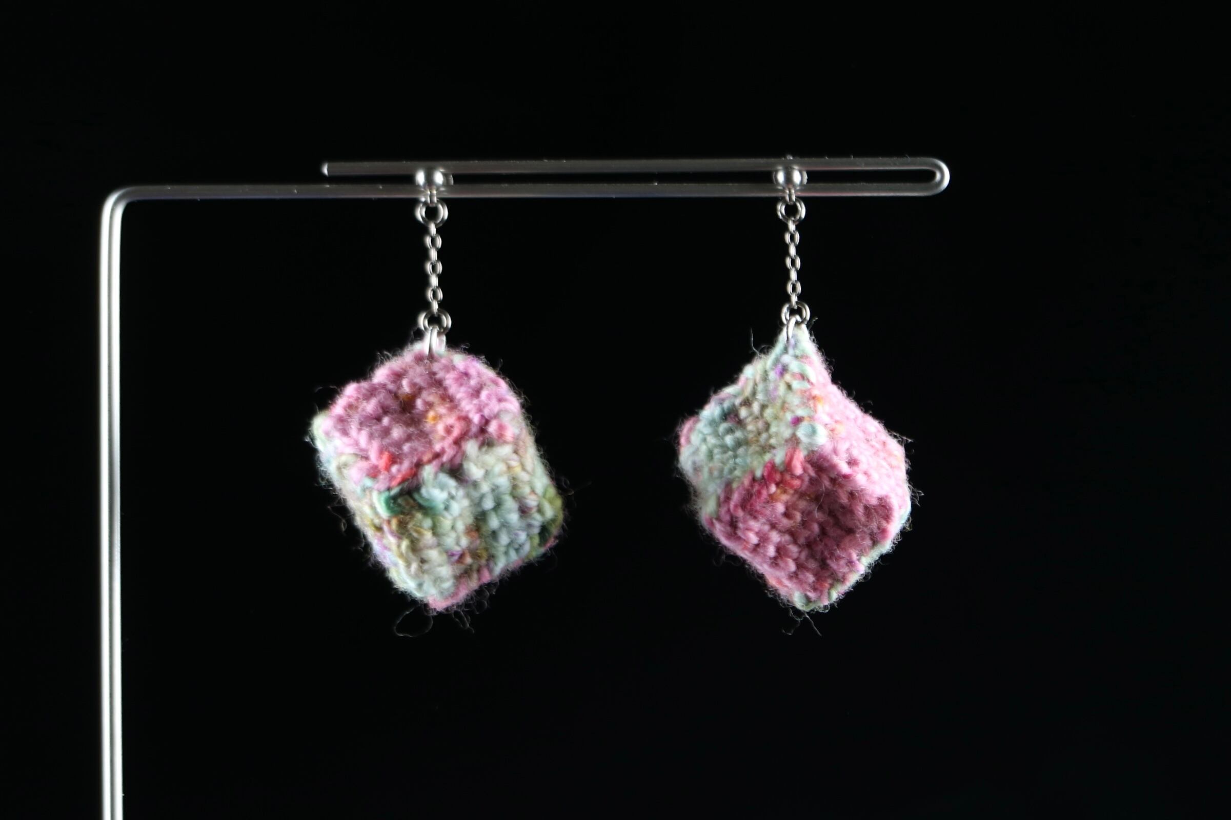 草木染め毛糸で編んだ、可愛らしいキューブ型のイヤリング / ピアスです。