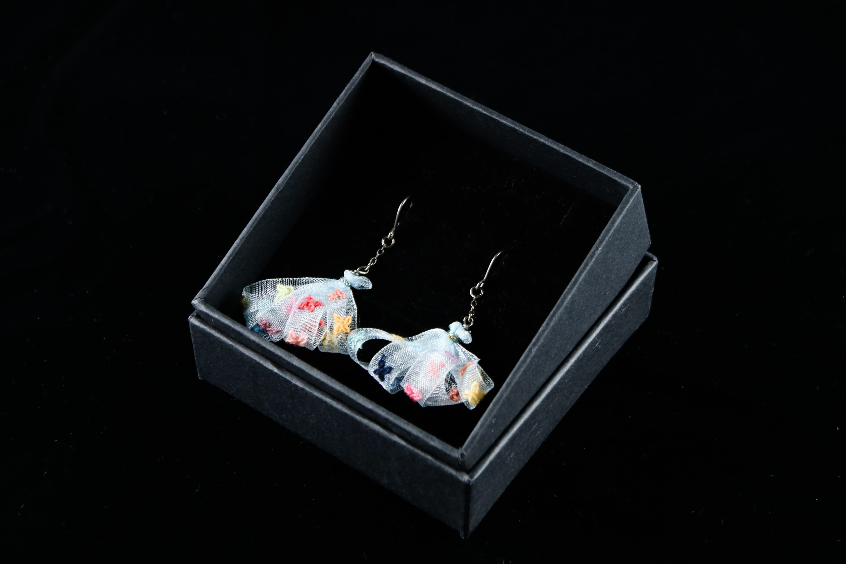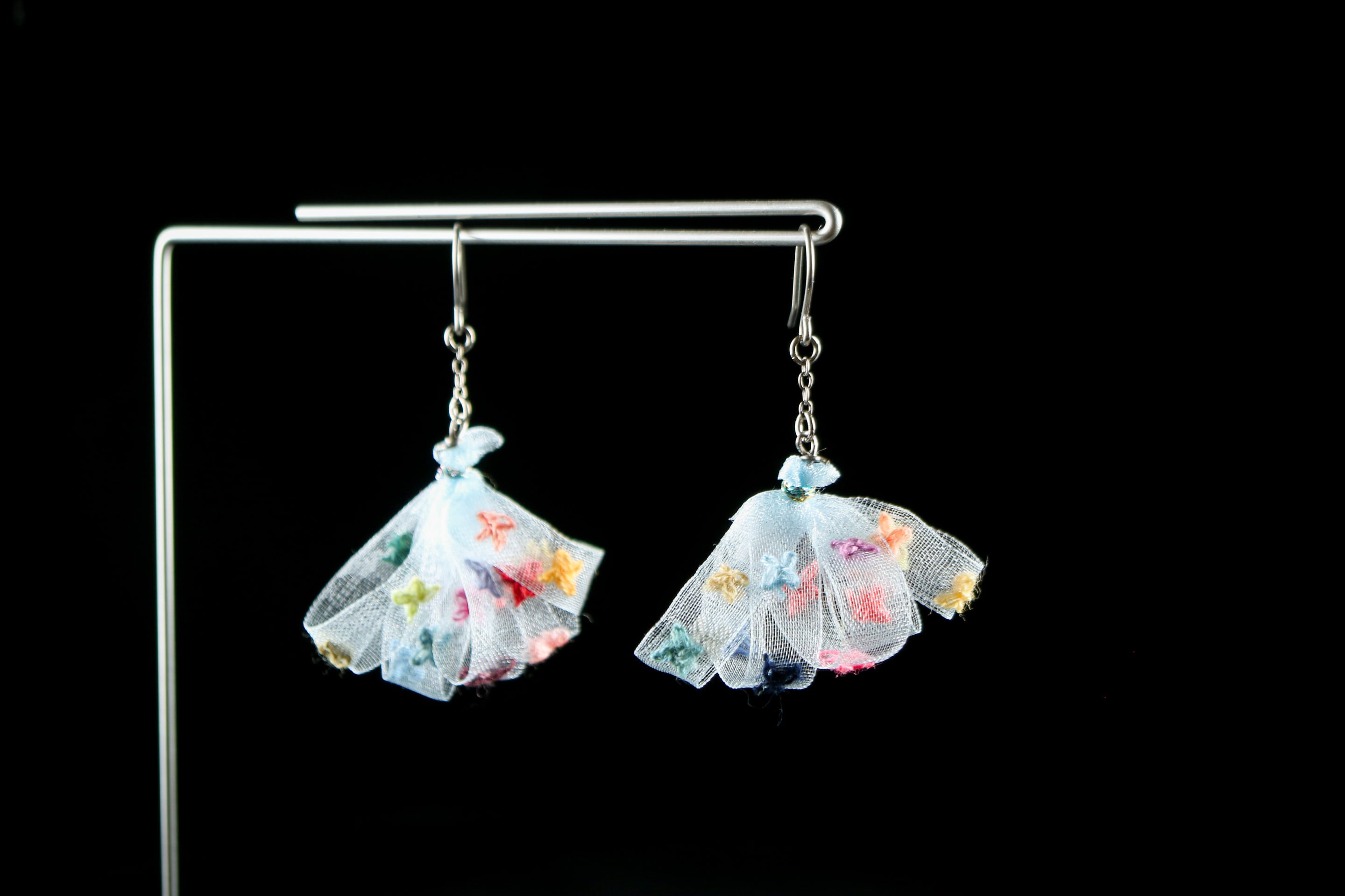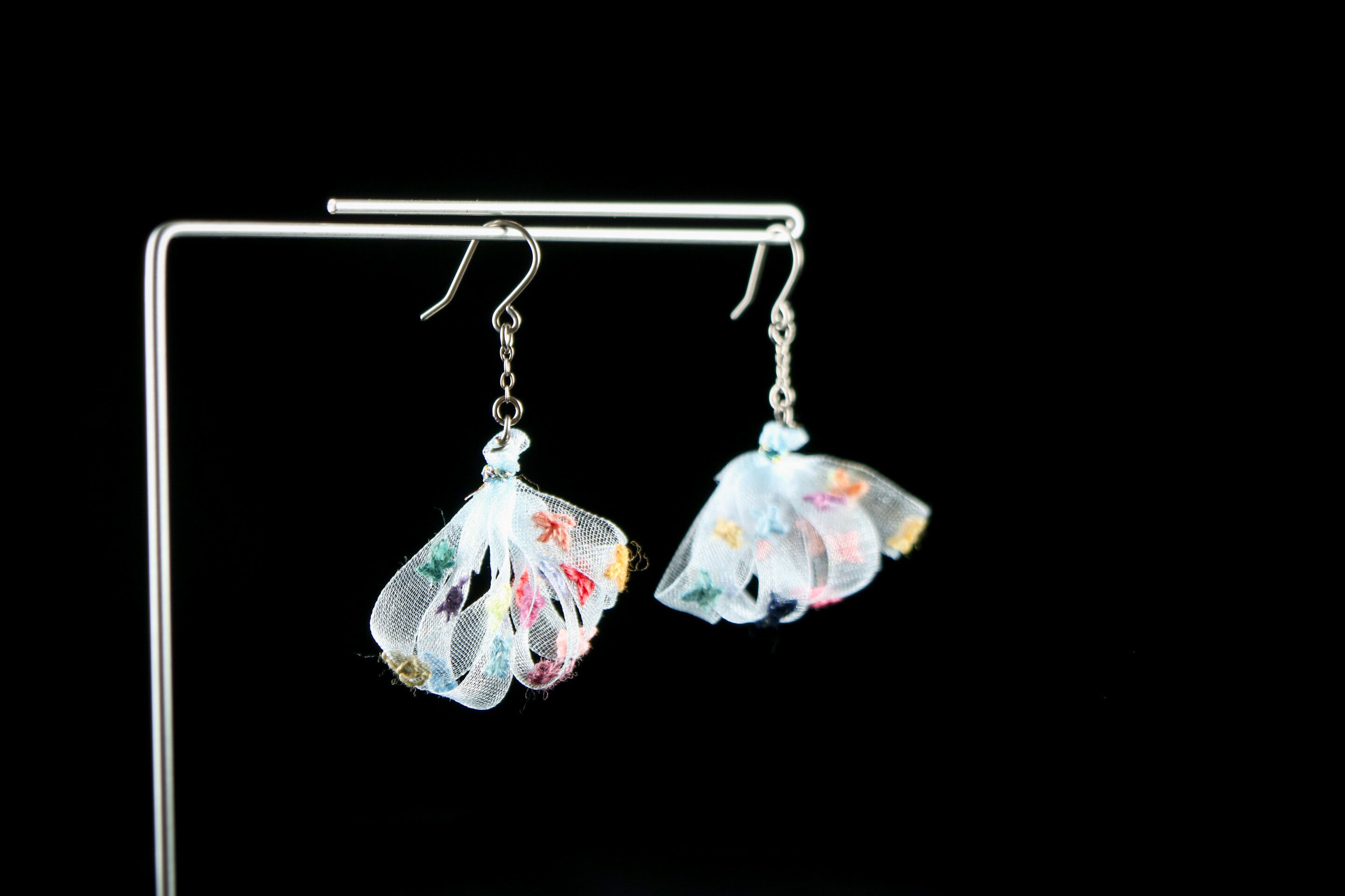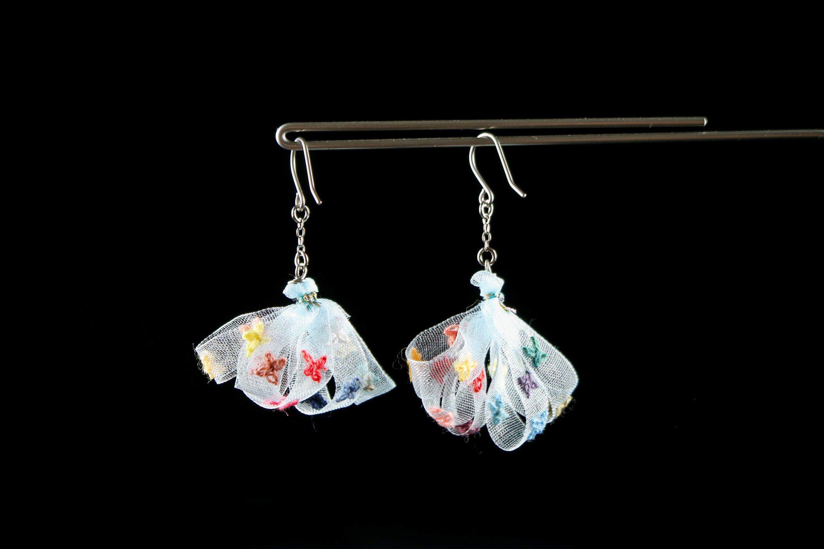 草木染め刺繍糸とベビーブルーのオーガンジーリボンが、やさしく華やかに耳元を彩るイヤリング/ピアスです。